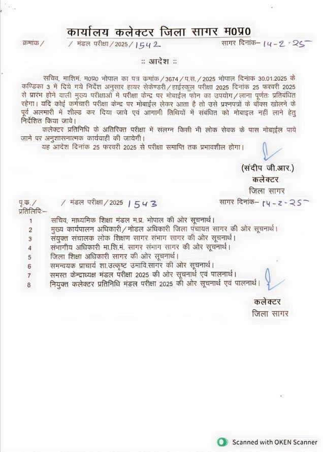 परीक्षा में मोबाइल से संबंधित सागर कलेक्टर का आदेश ..।।...