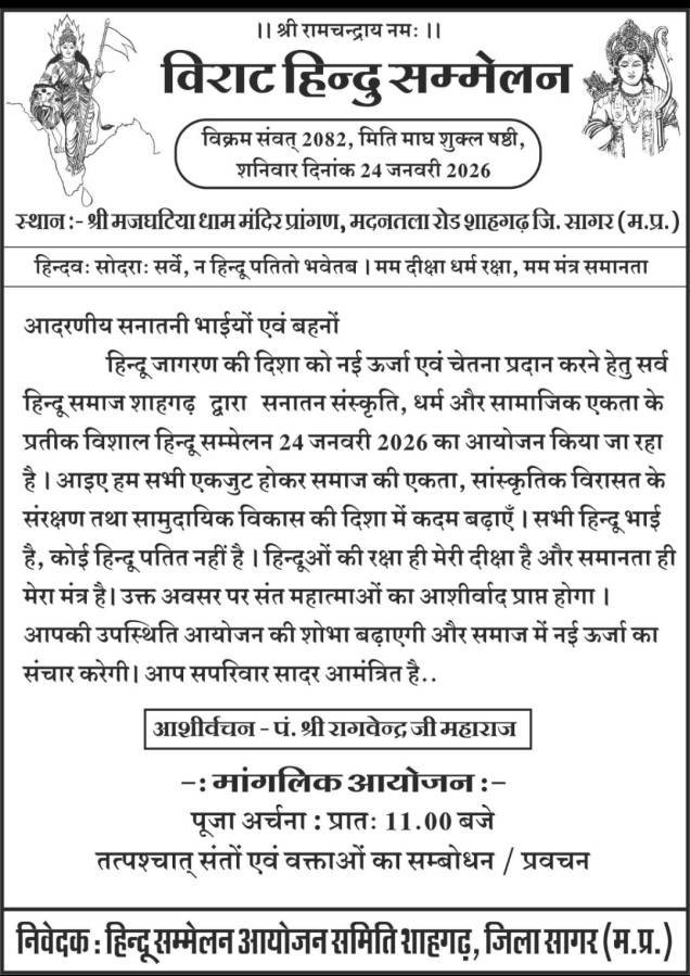 हिंदू सम्मेलन की तैयारियों को लेकर की गई बैठक। 24 को श्री मजघटिया धाम मंदिर प्रांगण, मदनतला रोड में होगा आयोजन।   शाहगढ़। नगर भवन में आगामी विराट हिंदू सम्मेलन की...